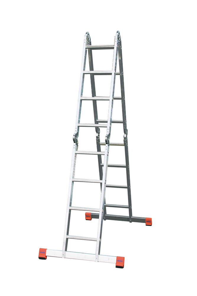 Четырехсекционная универсальная алюминиевая шарнирная лестница трансформер может применяться в качестве двусторонней стремянки, как обычная приставная лестница и как рабочая платформа. Удобна и практична при строительных отделочных работах. Легка в использовании и транспортировке. Без труда помещается в багажник легкового автомобиля. Дополнительно можно приобрести накладки для более комфортного использования лестницы-трансформера в качестве рабочего помоста. Накладки изготовлены из пропитанной смолой фанеры, являются абсолютно водостойкими, и крепятся к лестнице специальными защелками.